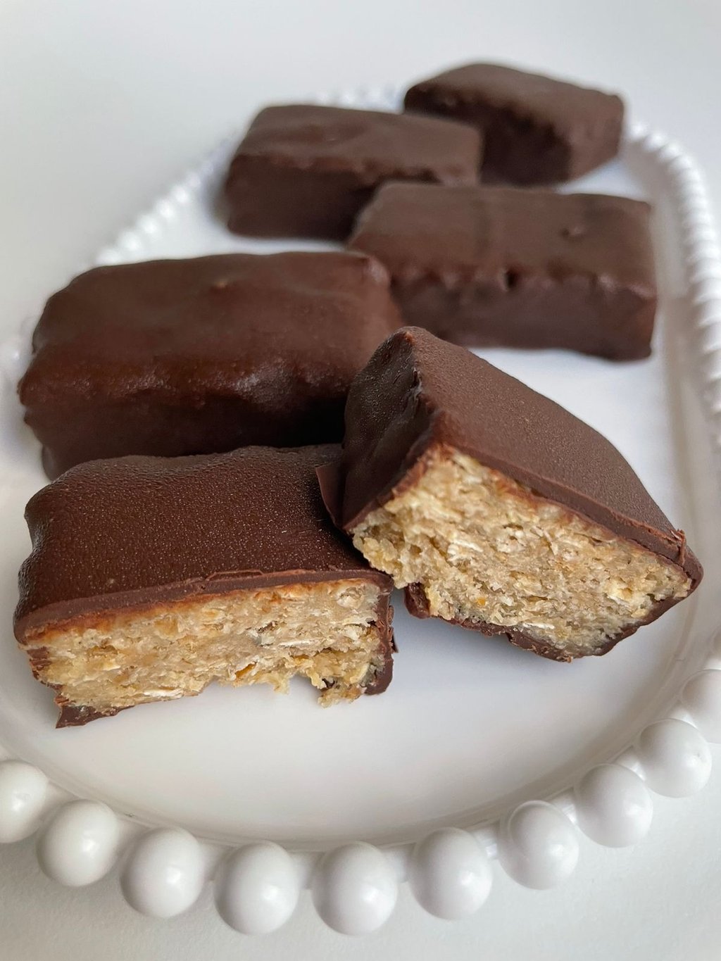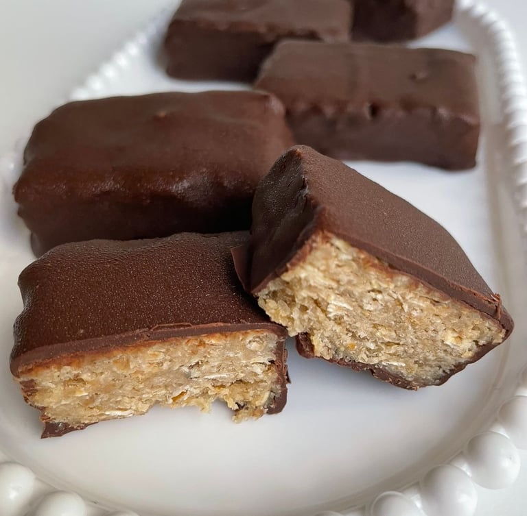Barrinha de aveia, pasta de amendoim integral e mel banhado no chocolate meio amargo! Ótima opção de fonte de fibras e gorduras boas!