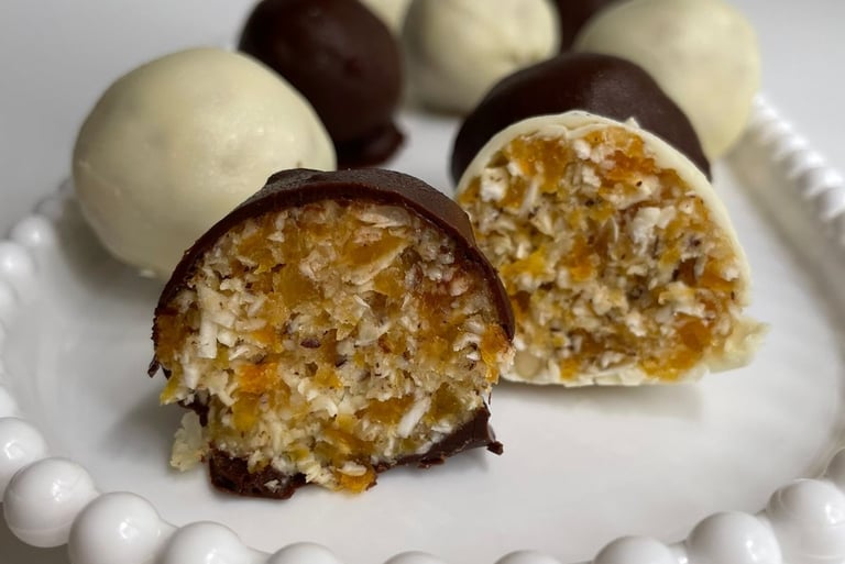 Feito com damasco, coco fresco e castanha do Pará! Banhado em chocolate meio amargo e/ou chocolate branco! Uma explosão de sabores e nutrientes!
